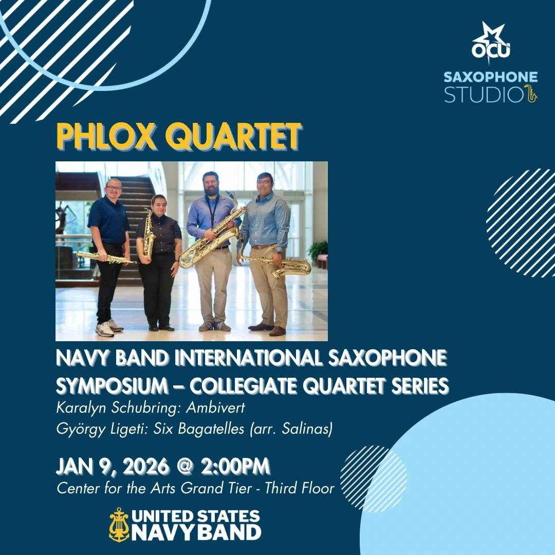 Uniquely, the OCU saxophone studio allows ample opportunities for crossover and collaboration. Saxophonists will play classical, jazz, contemporary, and chamber music and frequently engage in secondary areas such as woodwind doubling, vocal ensembles, piano, or composition.